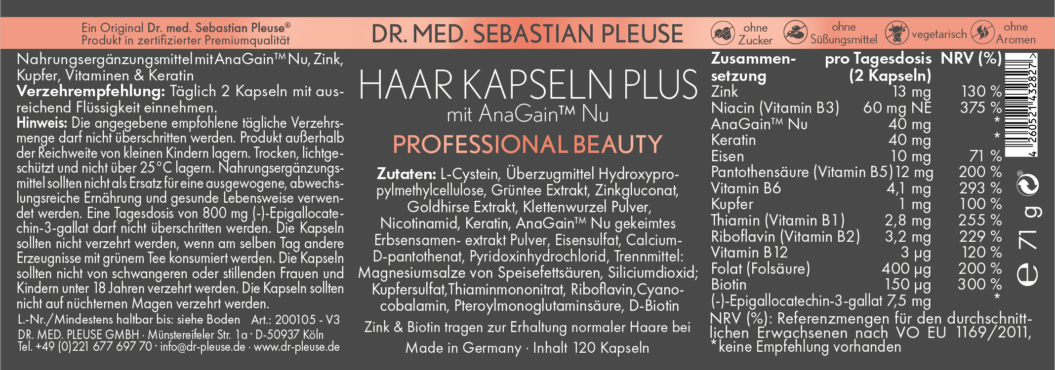 Pro Tagesdosis (2 Kapseln): Zink 13 mg, NRV 130 % - Niacin (Vitamin B3) 60 mg NE, NRV 375 % - Anagain™ Nu 40 mg, NRV** - Keratin 40 mg, NRV** - Eisen 10 mg, NRV 71,42 % - Pantothensäure (Vitamin B5) 12 mg, NRV 200 % - Vitamin B6 4,1 mg, NRV 292,85 % - Kupfer 1 mg, NRV 100 % - Thiamin (Vitamin B1) 2,8 mg, NRV 254,54 % - Riboflavin (Vitamin B2) 3,2 mg, NRV 228,57 % - Vitamin B12 3 µg, NRV 120 % - Folat (Folsäure) 400 µg, NRV 200 % - Biotin 150 µg, NRV 300 % - Epigallocatechin-3-gallat 7,5 mg, NRV**NRV (%): Referenzmengen für den durchschnittlichen Erwachsenen nach VO EU 1169/2011, **keine Empfehlung vorhanden