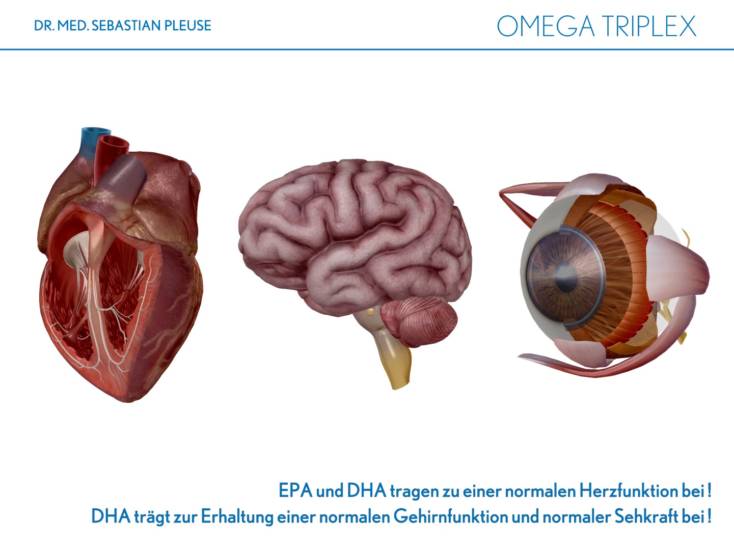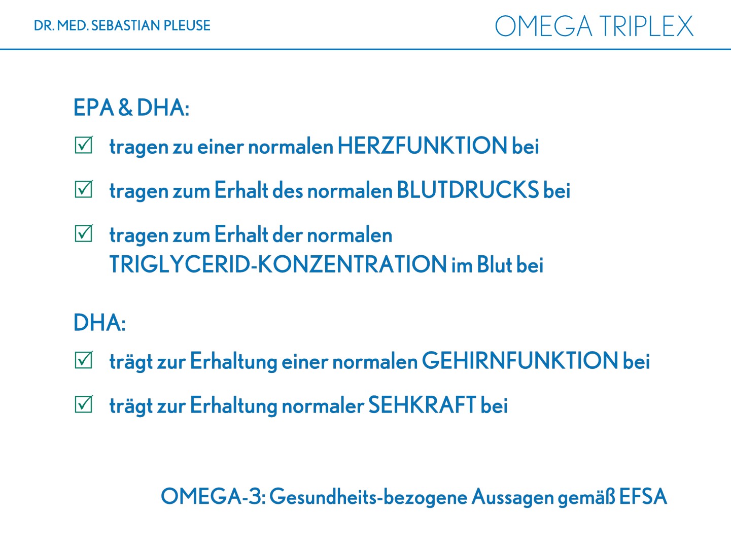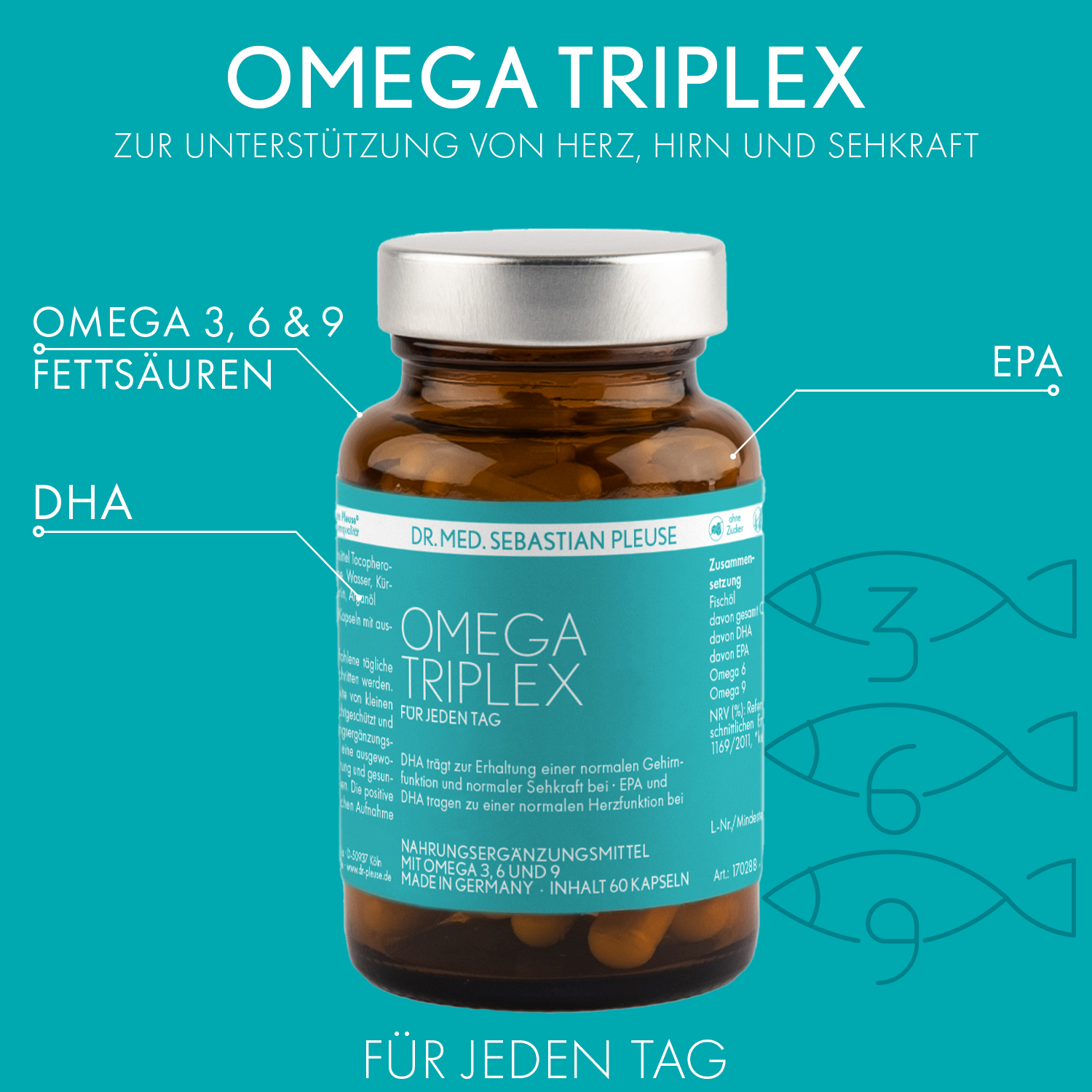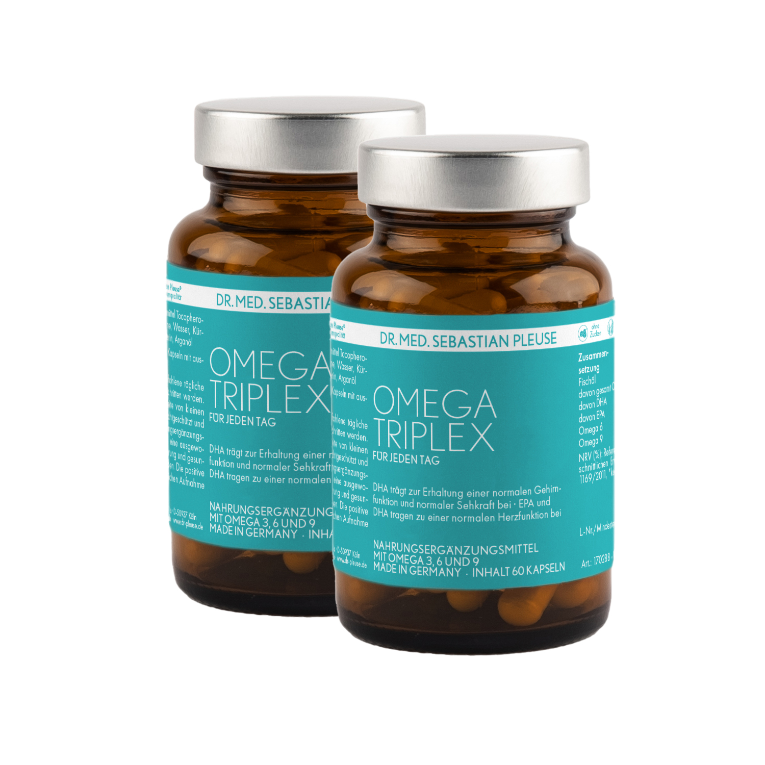 OMEGA TRIPLEX von Dr. med. Sebastian Pleuse basiert auf dem geprüften Markenrohstoff „Essential Omega®“ und enthält zusätzlich hochwertiges Hanföl, Kürbiskernöl und Arganöl. Diese Rezeptur liefert Omega-3, 6 und 9 in einem besonders ausgewogenen Verhältnis. Dabei ist die Einnahme von OMEGA TRIPLEX mit zwei Kapseln täglich sehr einfach. Die Kapseln können zu jeder Tageszeit eingenommen werden, auch beide zusammen. Nach der Einnahme kann es zu einem leichten Aufstoßen kommen. Um das zu vermeiden, kann man die Kapseln begleitend zu den Mahlzeiten einnehmen. Gönnen Sie sich etwas Gutes für Gehirn, Herz und Augen und machen Sie OMEGA TRIPLEX von Dr. med. Sebastian Pleuse zur täglichen Ergänzung Ihrer guten Ernährung!