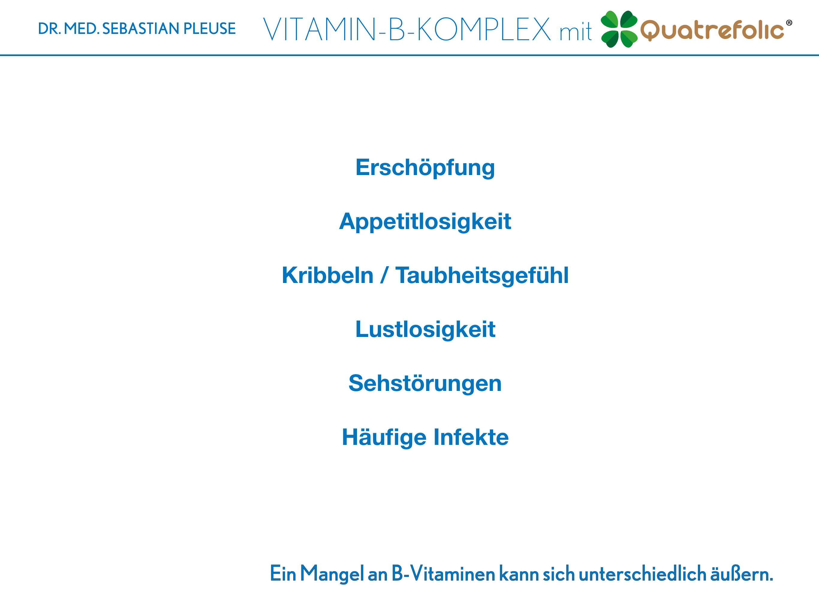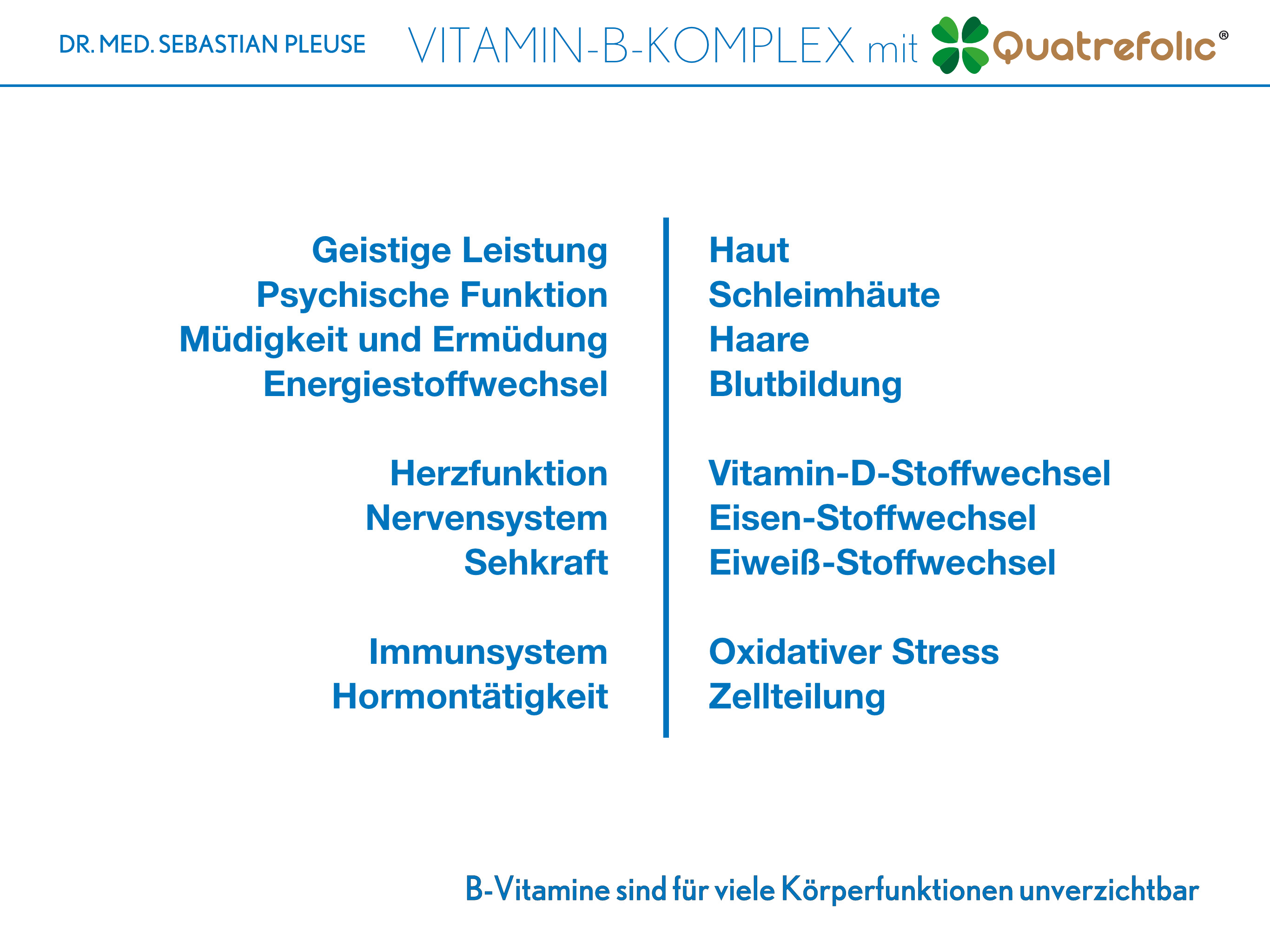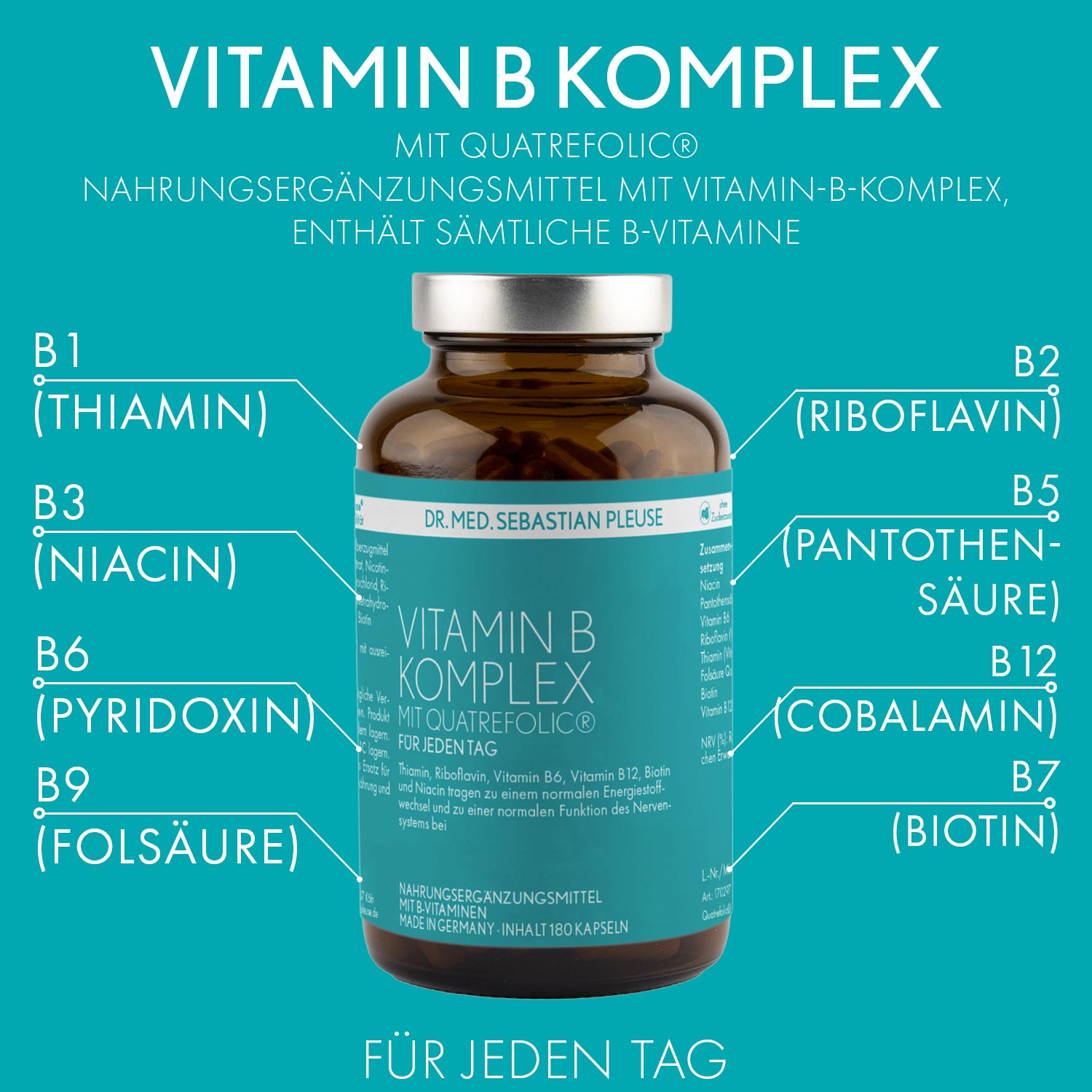 Der Vitamin-B-Komplex mit Quatrefolic® von Dr. med. Sebastian Pleuse basiert auf Braunhirse und enthält alle acht B-Vitamine in perfekt abgestimmter Dosierung. Bereits eine Kapsel täglich unterstützt die Versorgung mit diesen wichtigen Nährstoffen.