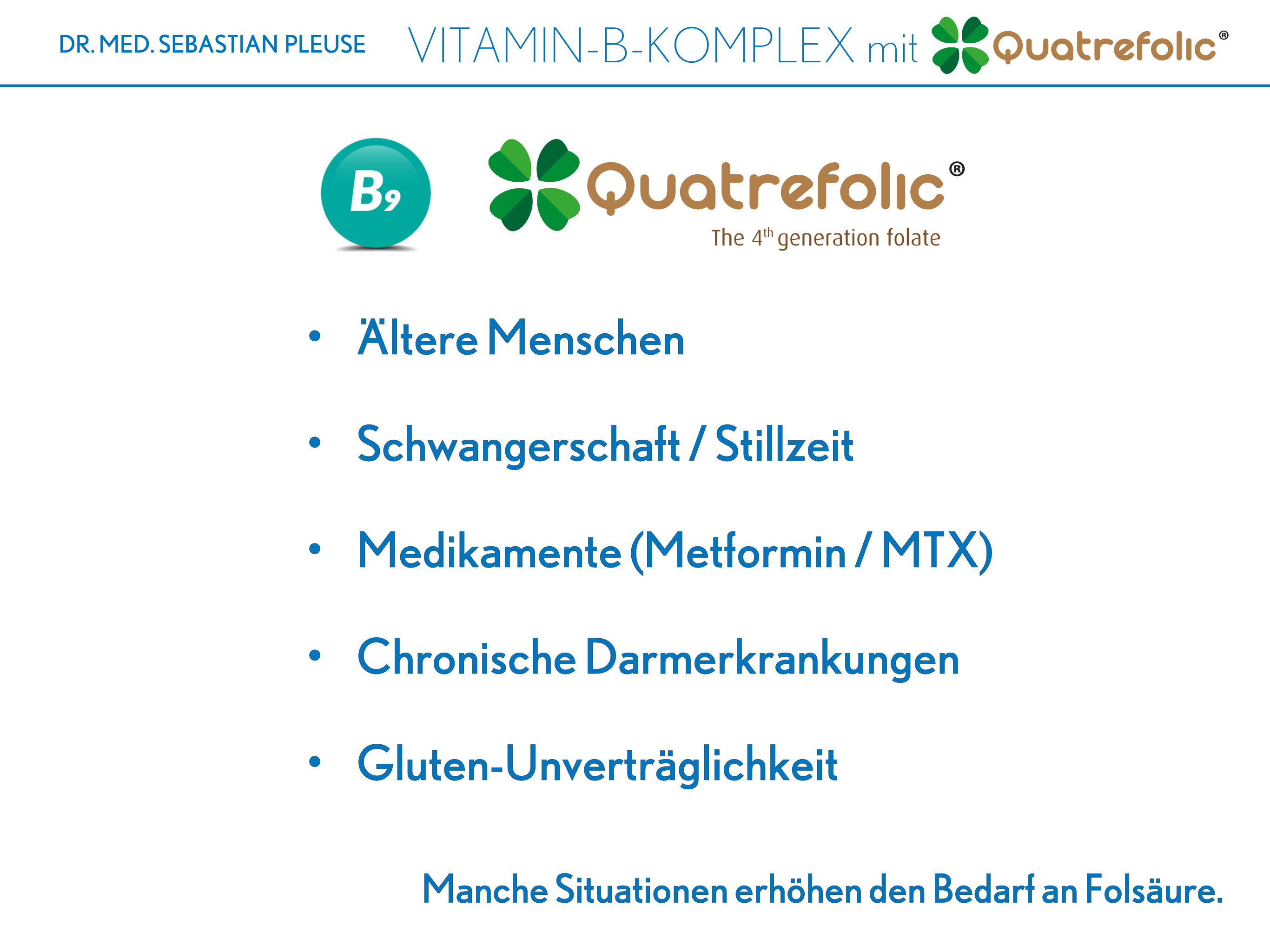 Dieses Vitamin ist sehr wichtig für Frauen während der Schwangerschaft und Stillzeit. Außerdem können bestimmte Herausforderungen mit dem Darm sowie die Einnahme einiger Medikamente zu einem erhöhten Bedarf an Folsäure führen, so dass Quatrefolic® seine Stärken hier ganz besonders ausspielen kann.