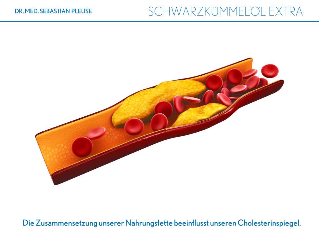 Die Zusammensetzung macht Schwarzkümmelöl so besonders, denn es enthält besonders viele einfach und mehrfach ungesättigte Fettsäuren und den besonders effektiven Inhaltsstoff Thymochinon. Der Ersatz gesättigter Fettsäuren durch ungesättigte Fettsäuren hat einen positiven Effekt auf das Cholesterin; unser Körper benötigt ungesättigte Fettsäuren außerdem als Baumaterial, vor allem für die Zellwände.