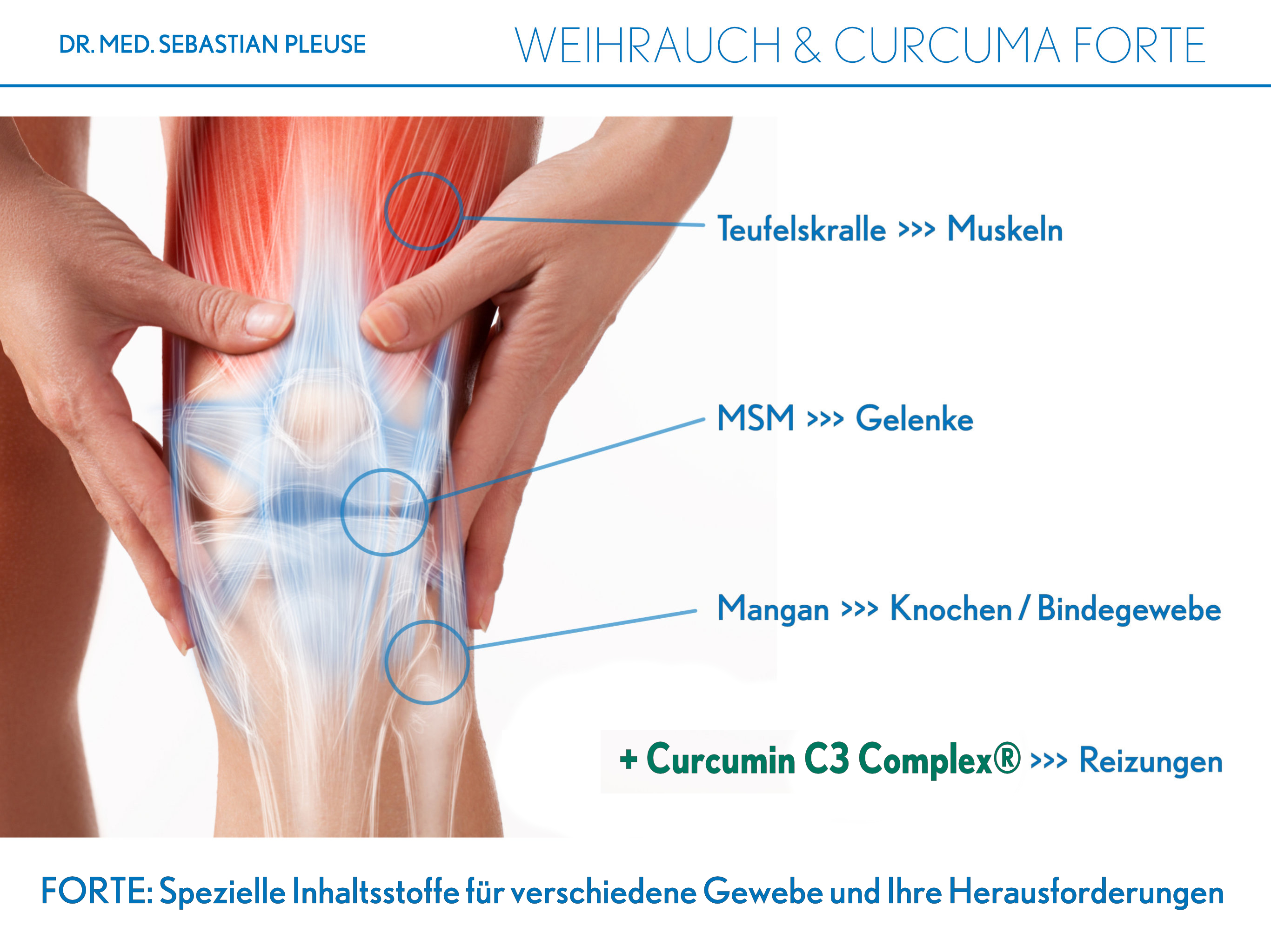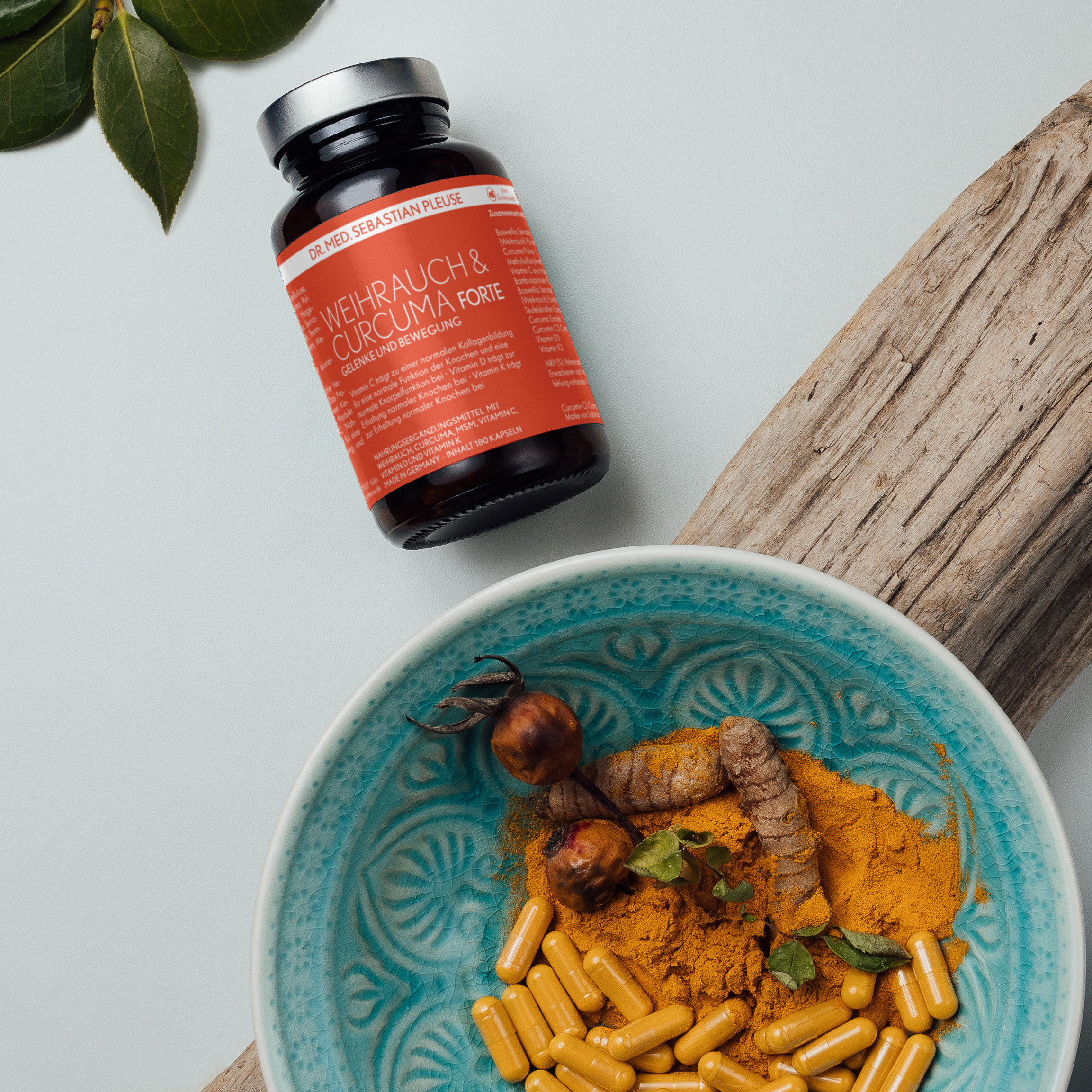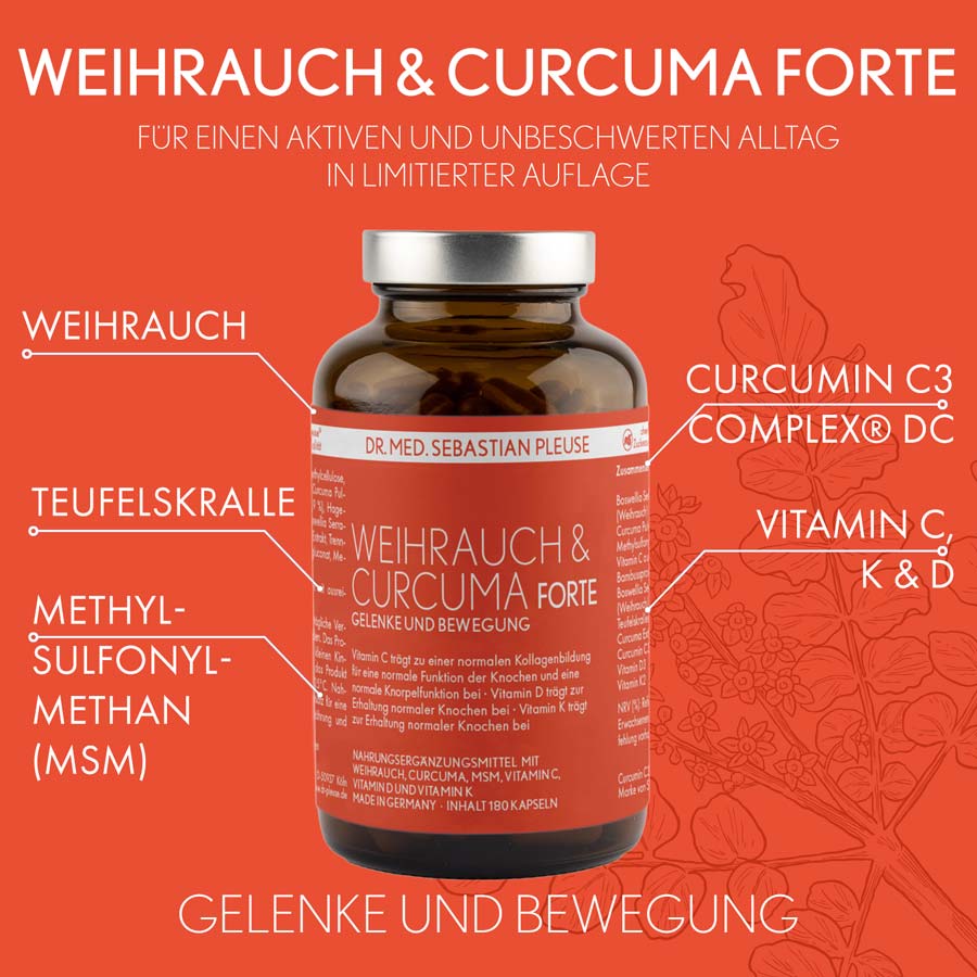 WEIHRAUCH & CURCUMA FORTE von Dr. med. Sebastian Pleuse enthält zusätzlich zu den hochwertigen Boswellia-Säuren des Weihrauchs das im Ayurveda begehrte Curcumin und die für den Bewegungsapparat bewährte Schwefelverbindung MSM.