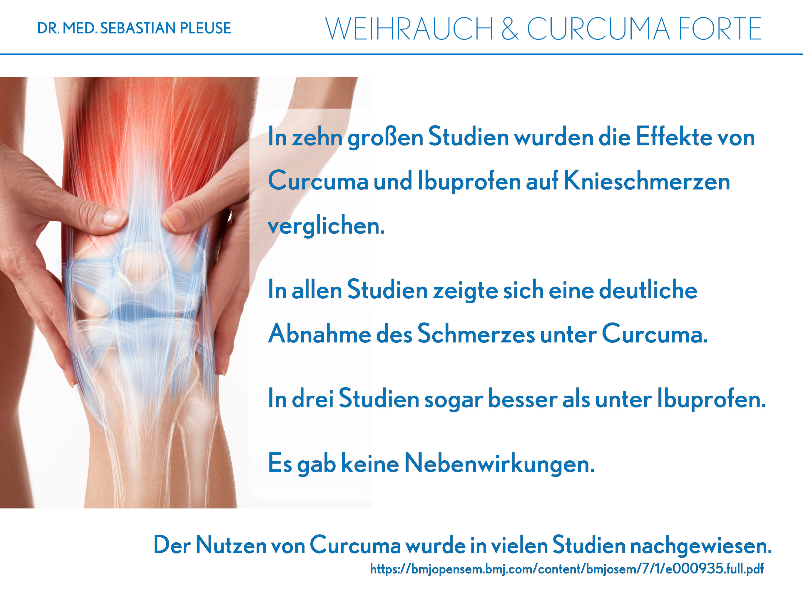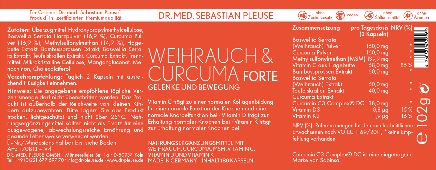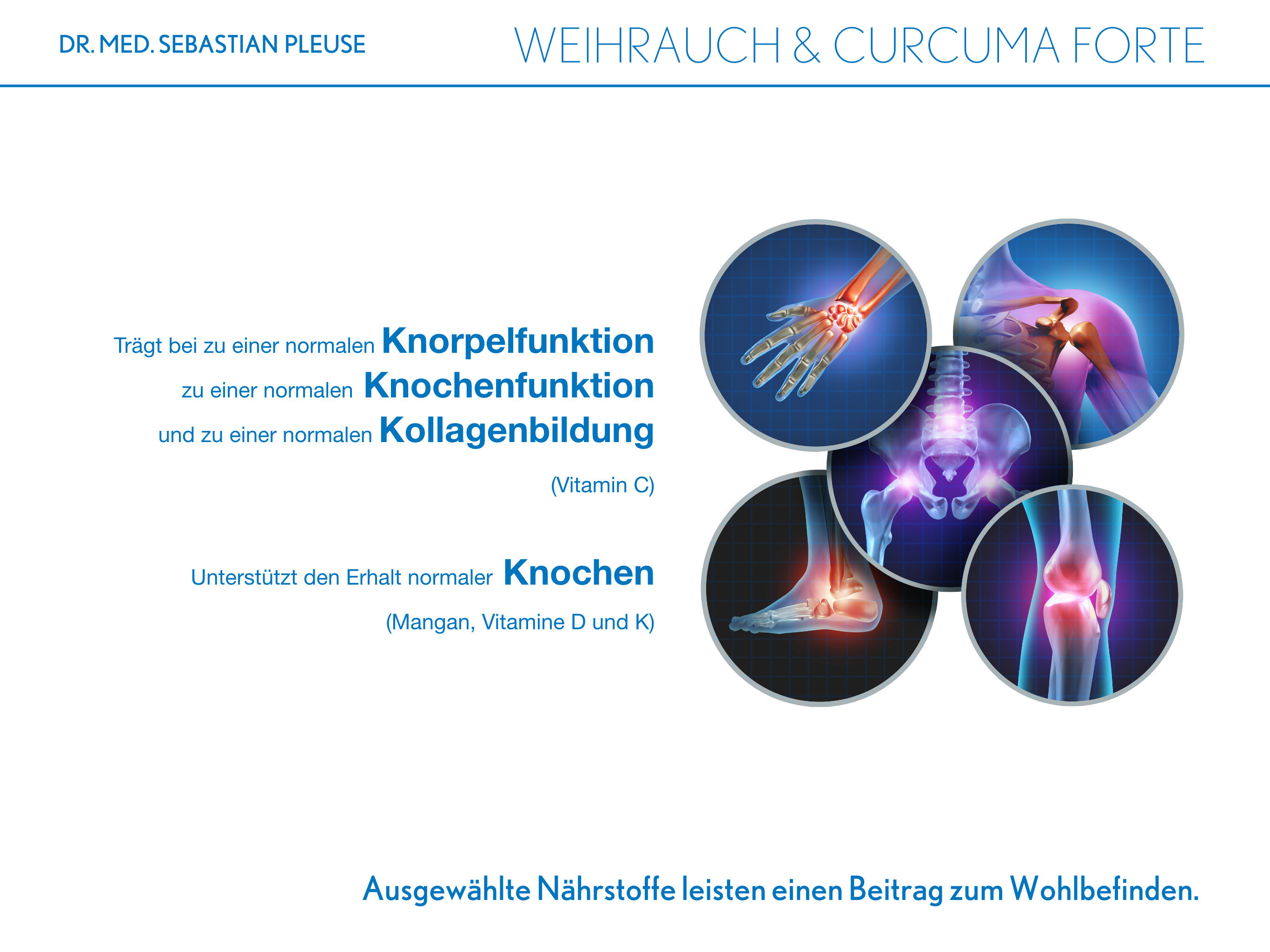 WEIHRAUCH & CURCUMA FORTE von Dr. med. Sebastian Pleuse enthält zusätzlich zu den hochwertigen Boswellia-Säuren des Weihrauchs das im Ayurveda begehrte Curcumin und die für den Bewegungsapparat bewährte Schwefelverbindung MSM.