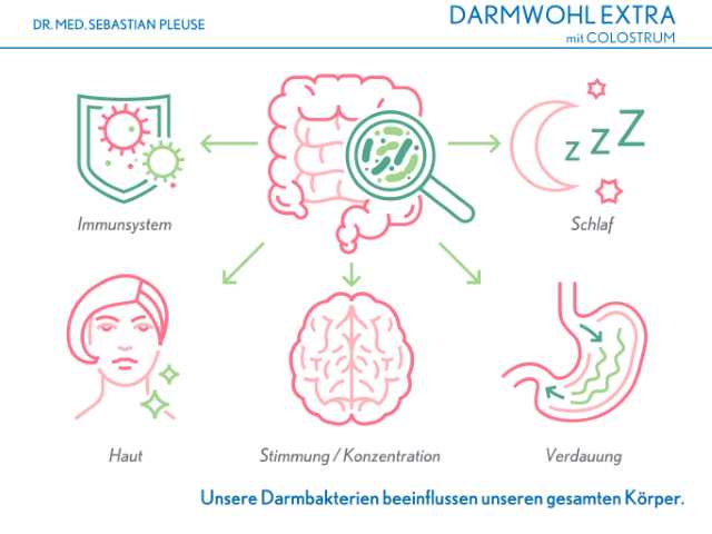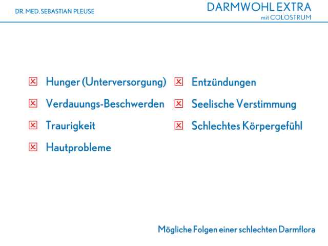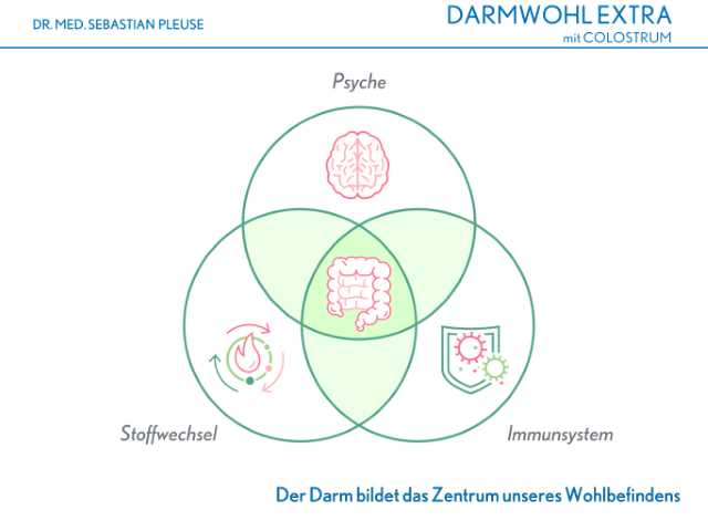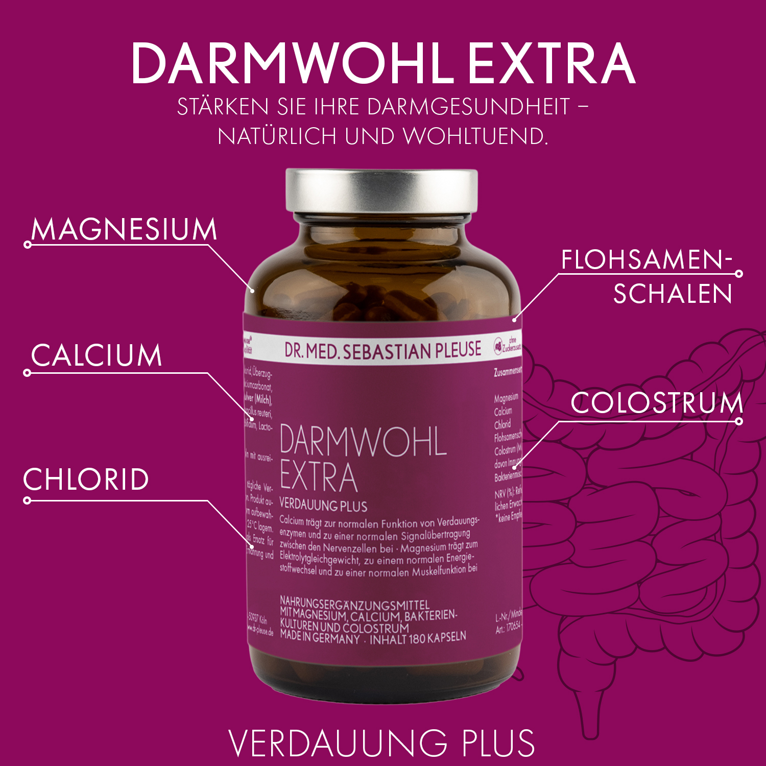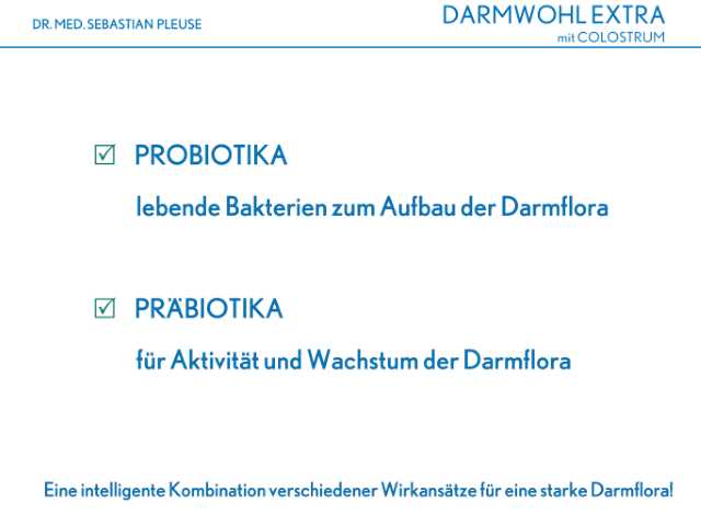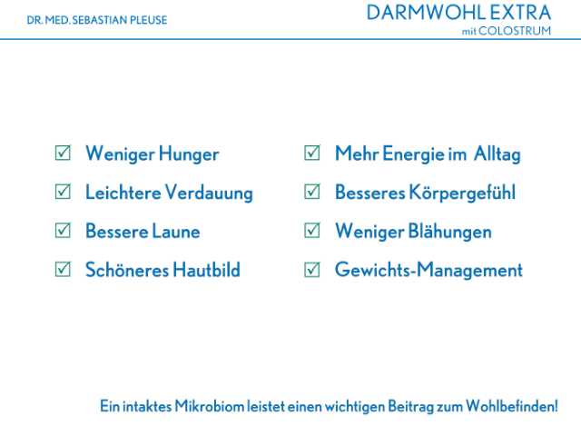 Aber das ist noch nicht alles! Im neuen DARMWOHL EXTRA ist erstmals auch Colostrum enthalten. Colostrum ist die sogenannte Vormilch der Kuh und steckt voller hochwirksamer Antikörper für unser Immunsystem, von dem ein sehr großer Teil im Darm sitzt.