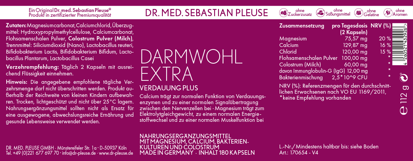 Pro Tagesdosis (2 Kapseln) Magnesium 75,57 mg NRV 20 %, Calcium 129,87 mg NRV 16 %, Chlorid 120,00 mg NRV 15 %, Flohsamenschalen Pulver 100,00 mg NRV *, Colostrum (Milch) 60,00 mg NRV *, davon Immunglobulin-G (IgG) 12,00 mg NRV *, Bakterienmischung 2,5*10^9 CFU NRV *. NRV (%): Referenzmenge für den durchschnittlichen Erwachsenen nach VO EU 1169/2011. *keine Empfehlung vorhanden